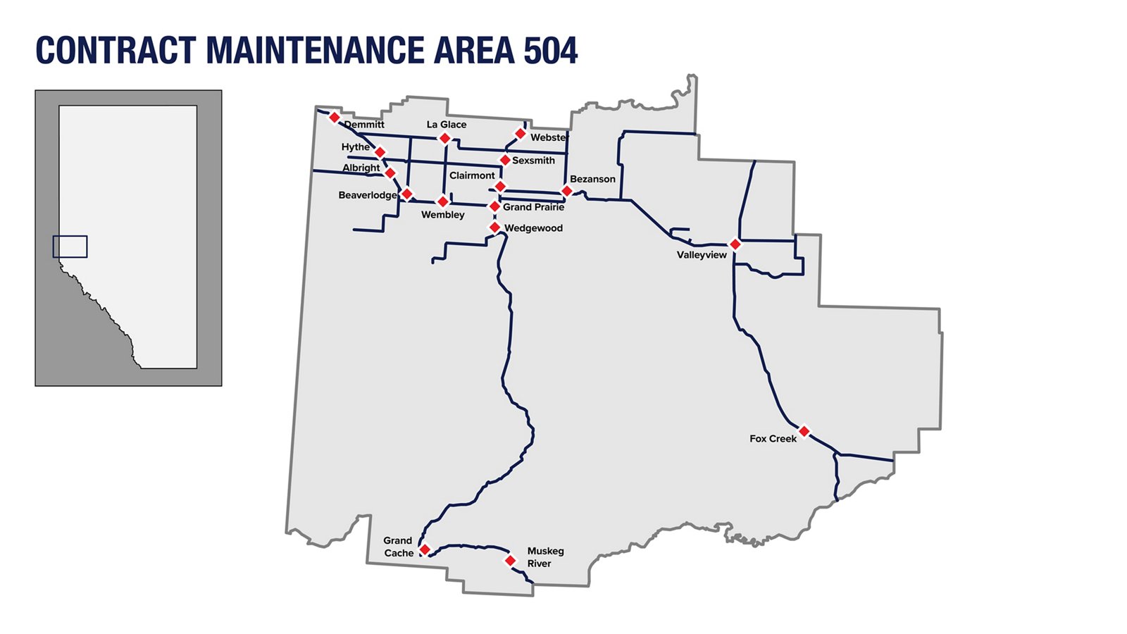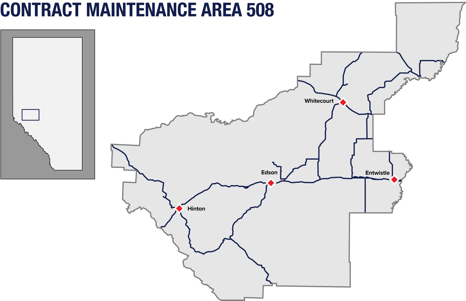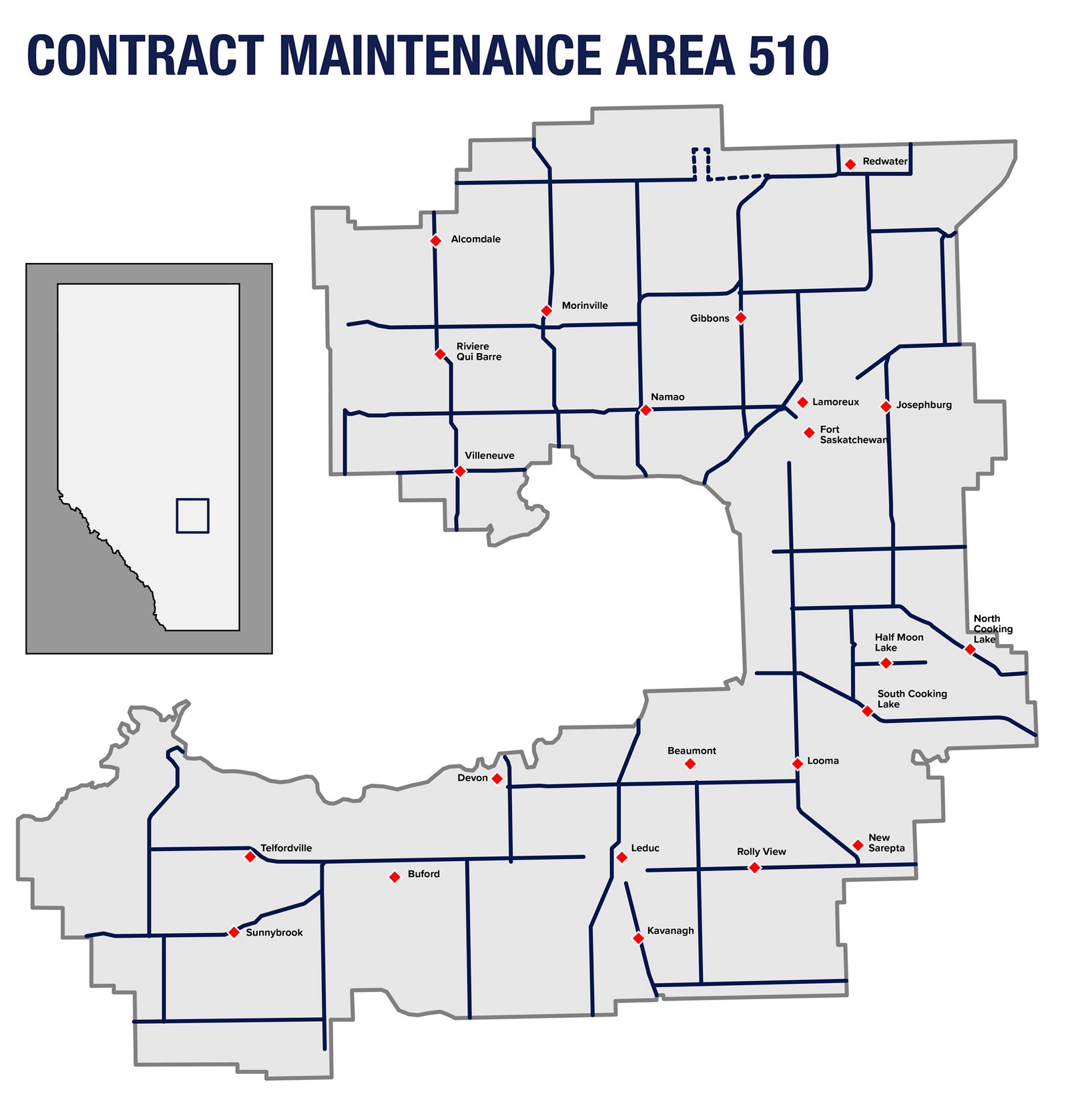 With the addition of CMAs 509 and 510, and the expansion of CMA 504, Ledcor Highways now operates in Drayton Valley, Fort Saskatchewan, Leduc, Mayerthorpe, Morinville, Glenevis, Stony Plain, Fox Creek and Valleyview along with the existing maintenance areas in Grande Prairie, Grande Cache, Beaverlodge, Whitecourt, Edson, Entwistle and Hinton.