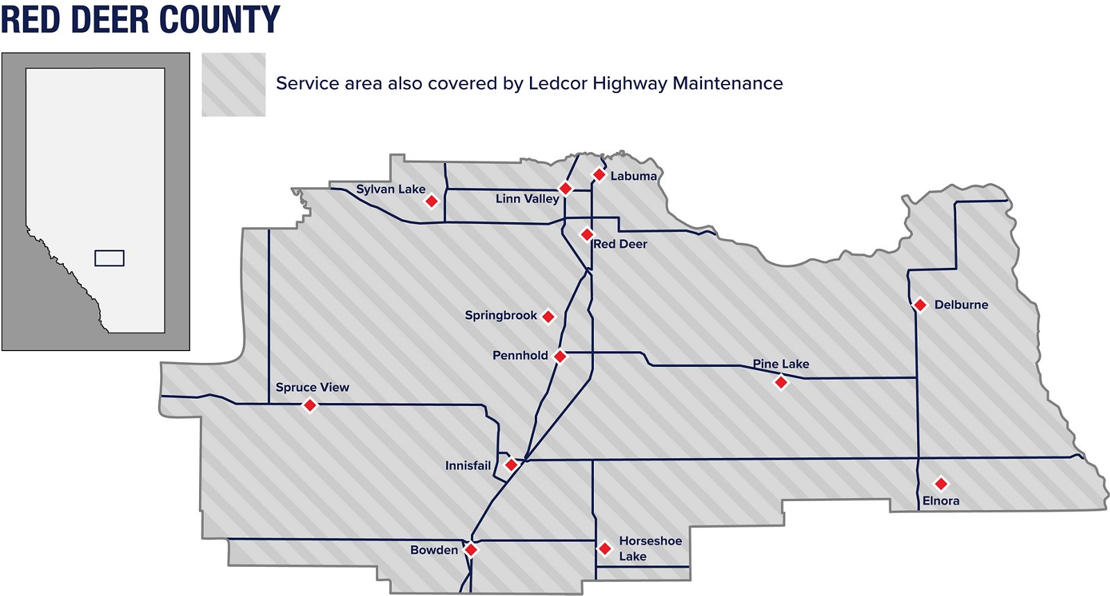 In 2018, Ledcor was awarded a second consecutive 5-year maintenance contract with the County of Red Deer, Alberta that began in 2013. The contract includes maintenance and repairs of over 575 lane-kilometers of paved roads within the County’s boundaries in Central Alberta. The road network under this contract includes a number of key commuter and collector roads serving as local strategic routes interconnecting with the provincial highway networks, including the Highway 2 North-South transportation corridor.